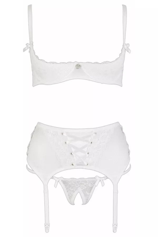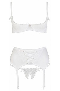 Questo set di lingerie da 3 pezzi è composto da un reggiseno push-up nudo tette, una cintura di garter dotata di 4 calze e un perizoma aperto al contorno.